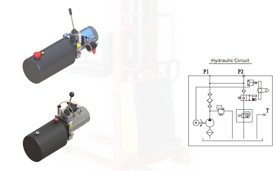 此動力單元專為全電動托盤車所設計。它們具有用于升高保持及下降功能,通常用于單作用缸。內置壓力補償節(jié)流閥用于控制下降速度。這些單元通常是垂直安裝的,具有從1.2KW-3.0KW不同的電機功率可選擇有鐵制及塑料油箱供選用。