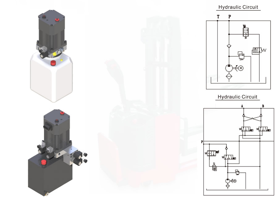 此動力單元專為全電動搬運車所設(shè)計。它們具有用于升高保持及下降功能,通常用于單作用缸。具有從2.2KW-3.0KW不同的電機功率可選擇有鐵制及塑料油箱供選用,低噪音可選用斜齒泵配置。